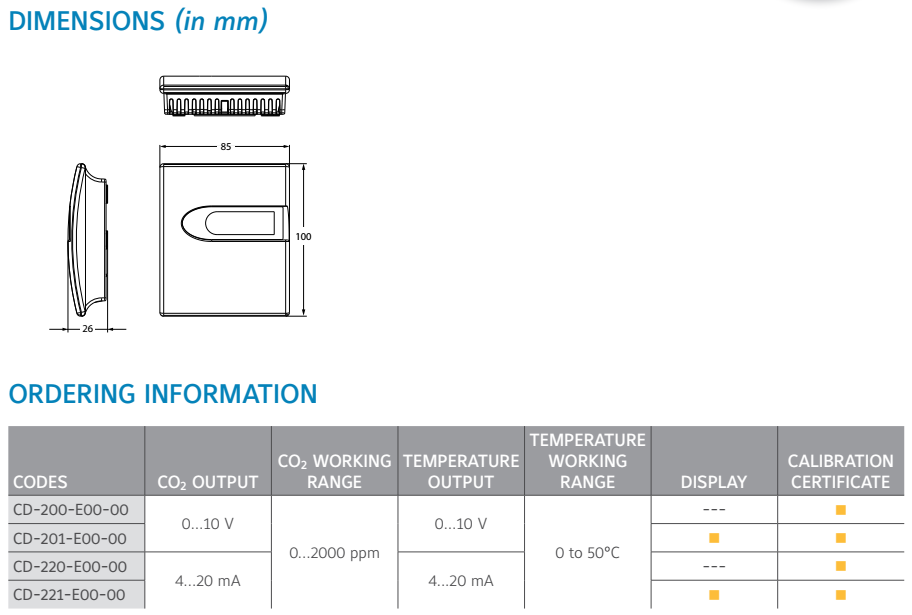 The CD-2xx-E00-00 series is a wall mount transmitter for measuring the CO2 levels and the relevant temperature within Heating, Ventilation and Air Conditioning applications. The CD-2xx Series incorporates a single beam dual wavelength NDIR CO2 sensor, which compensates for ageing effects, is highly insensitive to pollution and offers outstanding long term stability. A multiple point CO2 and T factory adjustment procedure leads to excellent CO2 measurement accuracy over the entire T working range