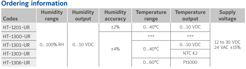 Wall Mount Humidity Sensor The HT-1000 series room humidity sensors provide active sensing of relative humidity and on specific models, also active/passive sensing of temperature in HVAC applications. It features a polymer capacitance humidity sensing element and provides within either ±2% or ±4% accuracy a voltage output signal proportional 0 to 100% relative humidity. The HT-1000 series room humidity sensors are designed for use with any type of Johnson Controls or third party HVAC controll