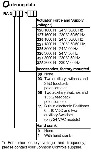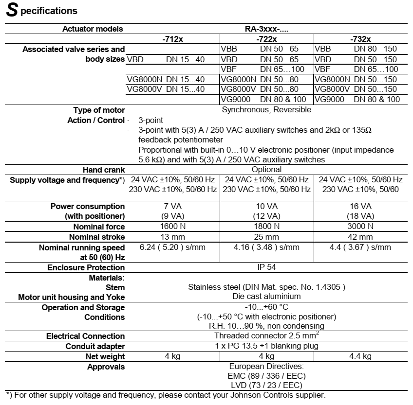 Floating and Proportional Control The RA-3000 series synchronous motor-driven reversible actuators are available for floating or with electric positioner for 0...10 V control. They feature factory calibrated pressure switches to provide specified close-off ratings. These actuators are available in three sizes with 1600 N, 1800 N and with 3000 N nominal force and can be used with JC flanged valves according to maximum close-off pressure ratings specified. Factory fitted options, such as 2kOhm