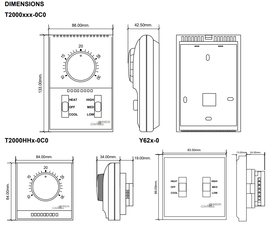 On the T2000ECx-0C0, switch positions provide ON and OFF temperature control in the controlled space. A second switch controls the LOW-MED-HIGH fan motor speeds.