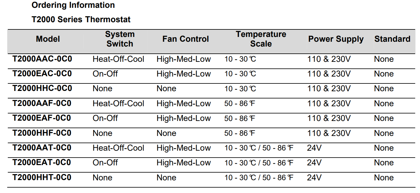 The T2000 thermostats provide heating, cooling and ventilating control for year-round air-conditioning units in commercial, industrial or residential installations. There are model for cooling only, heating only and heating-cooling fan coil system can be integrate with the manual or remote heat-cool changeover control. Integral with heavy duty slide switches provide HIGH-MED-LOW fan speed selection and ONOFF or HEAT-OFF-COOL system control. T2000 series thermostat is suitable for 2-pipe or 4-pipe fan coil application, which can be fitted with the VB5000 zone valve and VA7010 actuator. These thermostats are used for low / line voltage application, and typical uses include fan coils, electrical heaters and air handling units