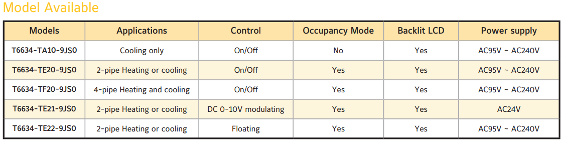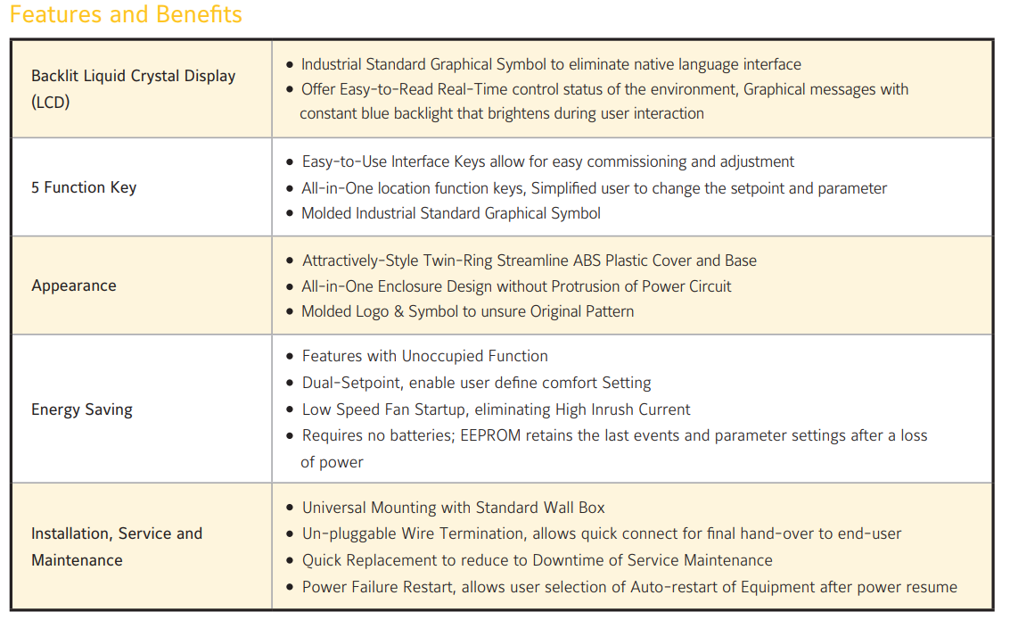 The T6000 thermostats come with 24-hours timer that allows user to schedule On-Time or Off-Time for the fan coil depending user needs. Additional Dry-contact for Occupancy mode that allows better comfort control and to achieve energy cost saving.