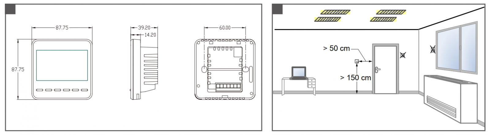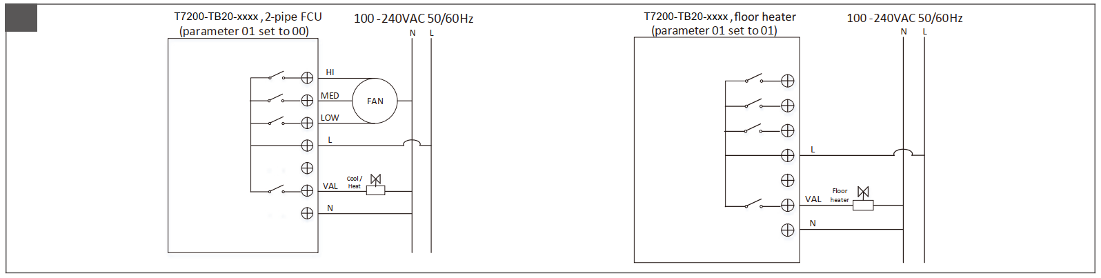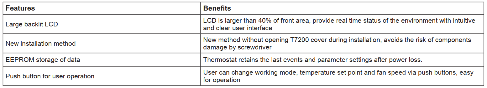 The T7200 series LCD thermostats are designed to control heating and cooling through air conditioning unit in commercial and residential application. T7200 features with large LCD screen that displays the status of work mode (cooling, heating, air venting, floor heating), fan speed, indoor temperature and set point etc.