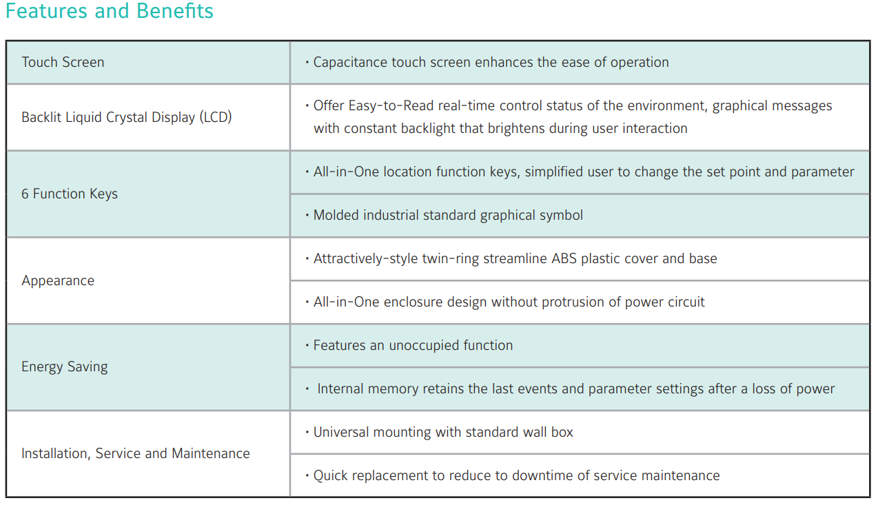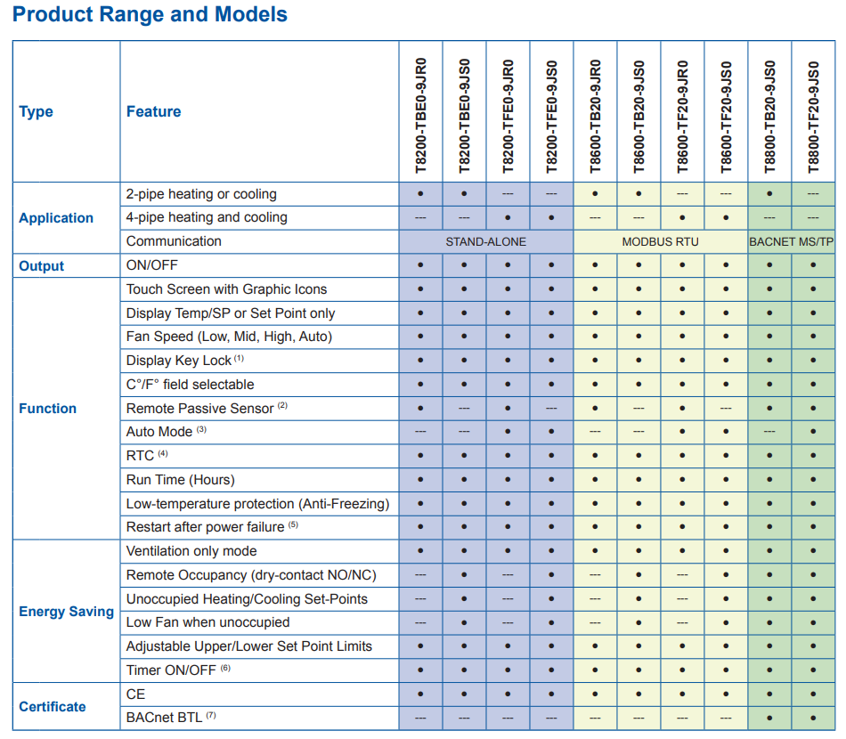 The T8 Series includes the T8200, T8600 and T8800 touch screen thermostats designed to control heating and cooling in commercial, industrial and residential installation. Typical applications include the control of Fan Coil units, Packaged terminal air conditioners and combination of heating and cooling equipment. As part of the system, the T8 thermostats control two-way or three-way valves and multi-speed line voltage fans. In the T8 range beside the T8200 Stand Alone models, the T8600 a