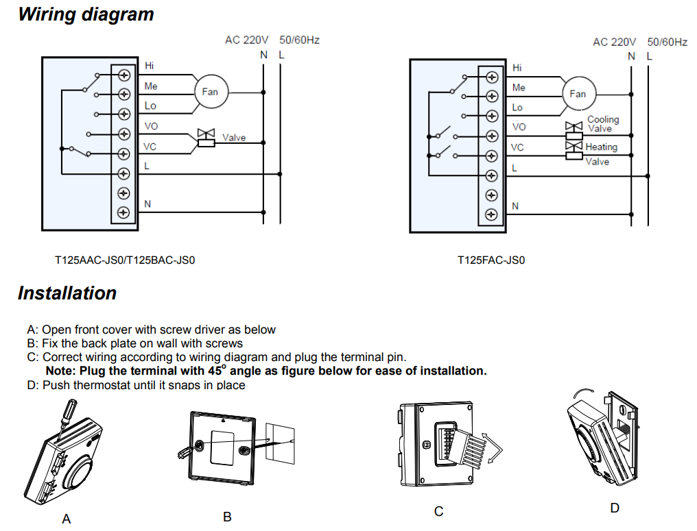 T125 Electric Fan Coil Thermostat - New Generation T125 Electric Fan Coil Thermostats are designed to control heating, cooling, or air conditioning unit in Commercial, Industrial and Residential Installation. Typical Application includes the control of fan coil units, packaged terminal air conditioners and combination heating and cooling equipment. As part of the system that consists of a two-way or three-way valve and a multi-speed line voltage fan. The aesthetic design thermostat featu